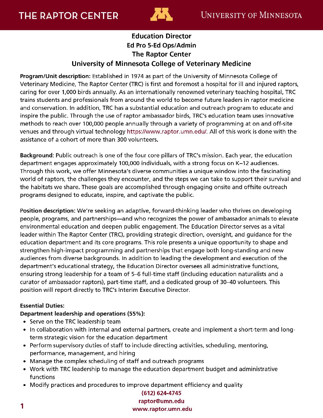 The Education Director serves as a vital leader within The Raptor Center (TRC), providing strategic direction, oversight, and guidance for the education department and its core programs. This role presents a unique opportunity to shape and strengthen high-impact programming and partnerships that engage both long-standing and new audiences from diverse backgrounds. In addition to leading the development and execution of the department’s educational strategy, the Education Director oversees all administrative functions, ensuring strong leadership for a team of 5–6 full-time staff (including education naturalists and a curator of ambassador raptors), part-time staff, and a dedicated group of 30–40 volunteers. This position will report directly to TRC’s Interim Executive Director.