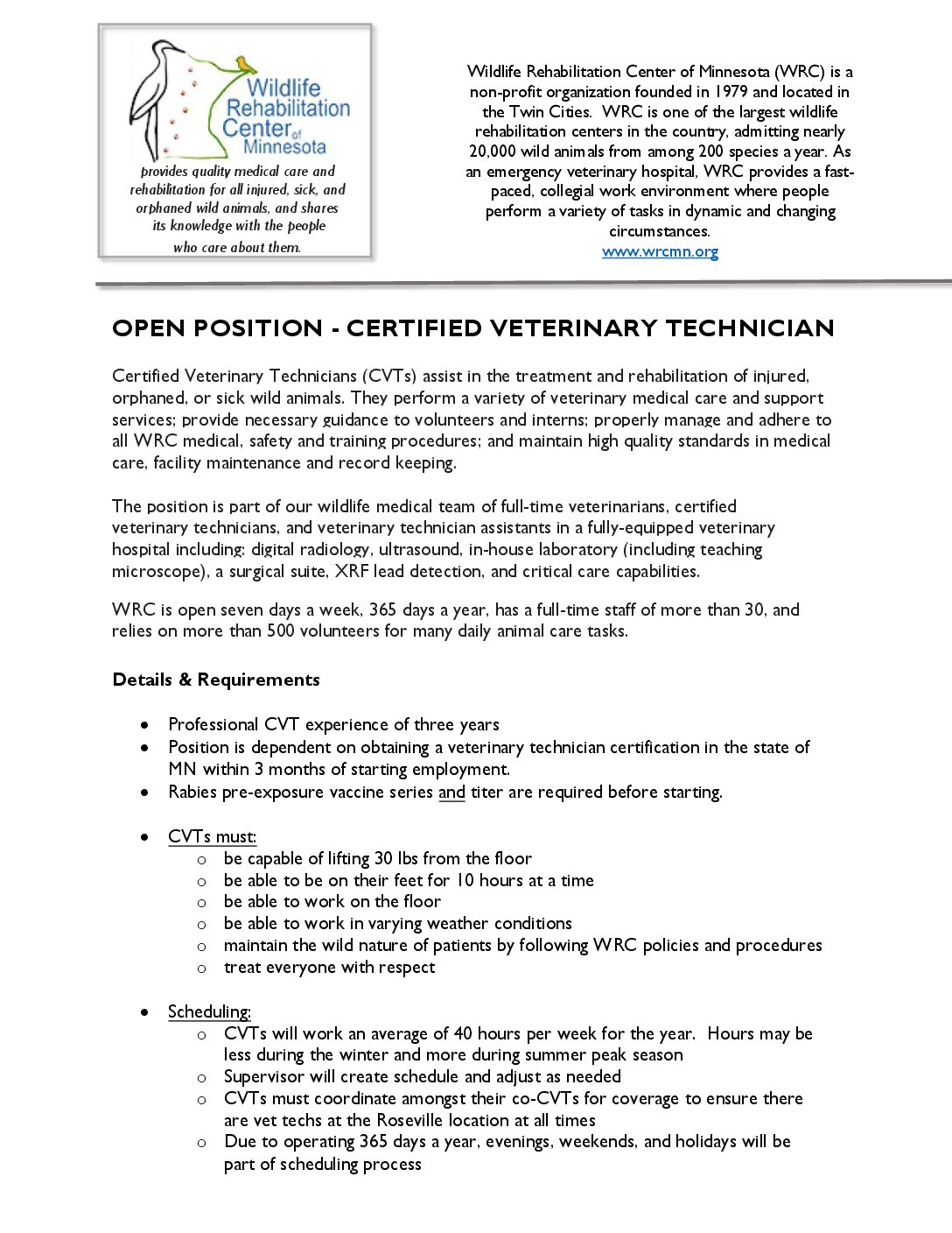 - Position is dependent on obtaining a veterinary technician certification in the state of MN within 3 months of starting employment.