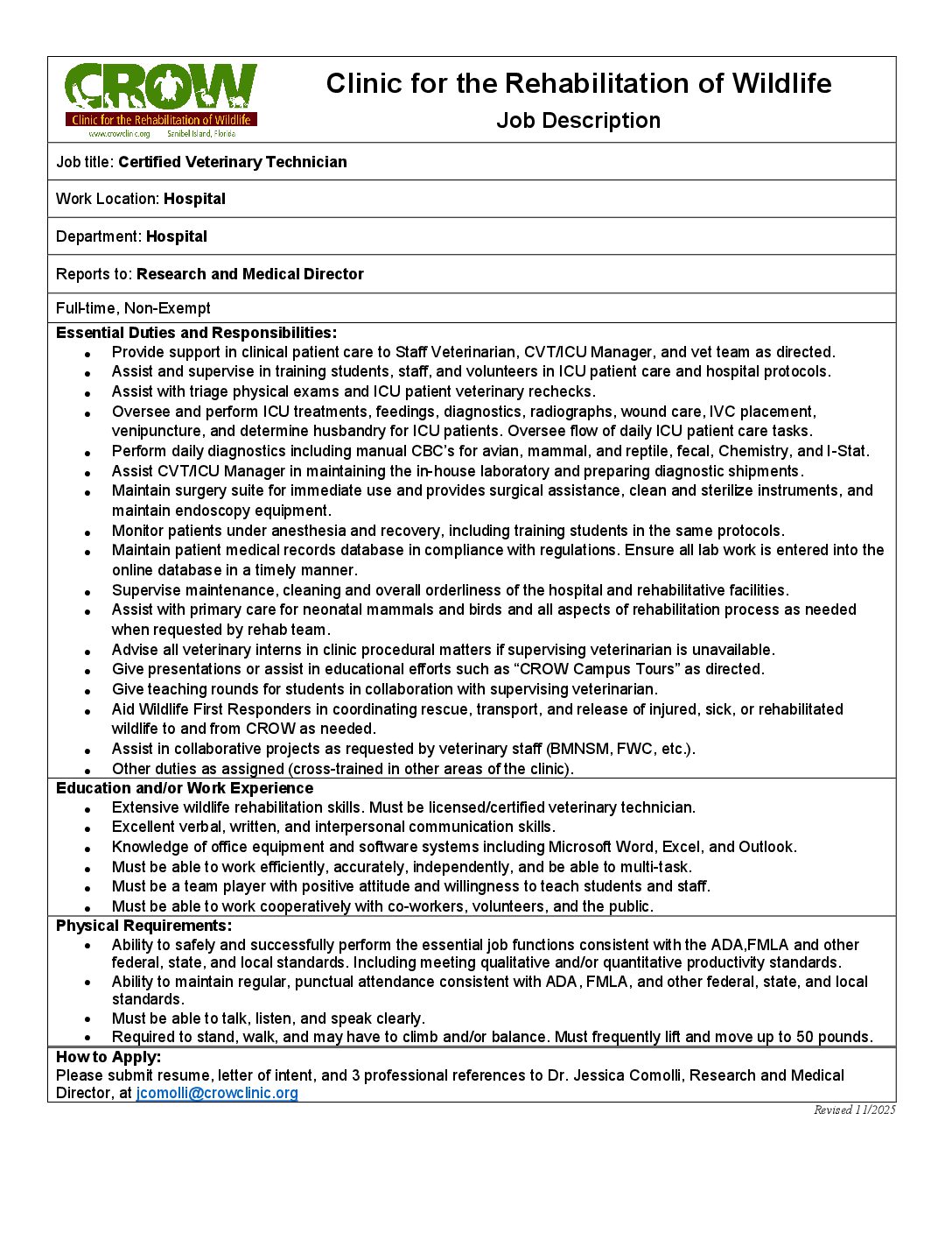 • Extensive wildlife rehabilitation skills. Must be licensed/certified veterinary technician.