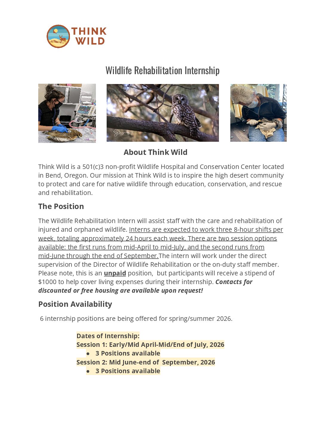 If you are sick, stay home! Think Wild reserves the right to revise or cancel the internship program at any time in compliance with Oregon Health Authority guidelines.