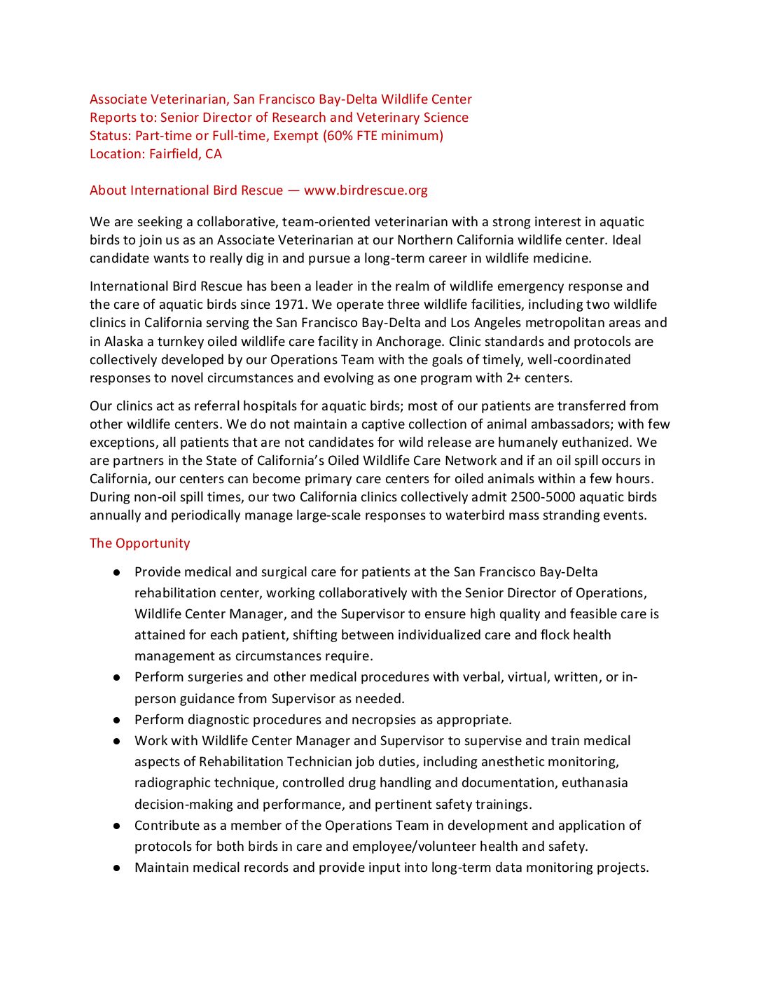 We are seeking a collaborative, team-oriented veterinarian with a strong interest in aquatic birds to join us as an Associate Veterinarian at our Northern California wildlife center. Ideal candidate wants to really dig in and pursue a long-term career in wildlife medicine.