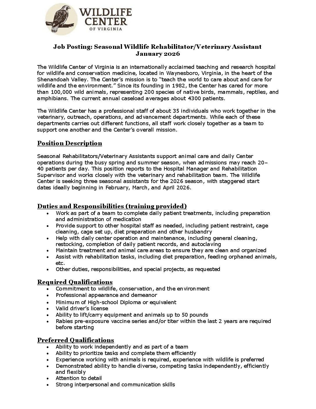 The Wildlife Center of Virginia (WCV) is an equal opportunity employer. WCV will not discriminate against applicants or employees on the basis of race, color, religion, national origin, age, sex, pregnancy (including childbirth or related medical condition), disability, genetic information, sexual orientation, gender identity, military status, citizenship, or any other class protected by applicable law. We reserve the right to alter, change, modify, and/or terminate this job posting at any time without notice, or obligation, to any party.