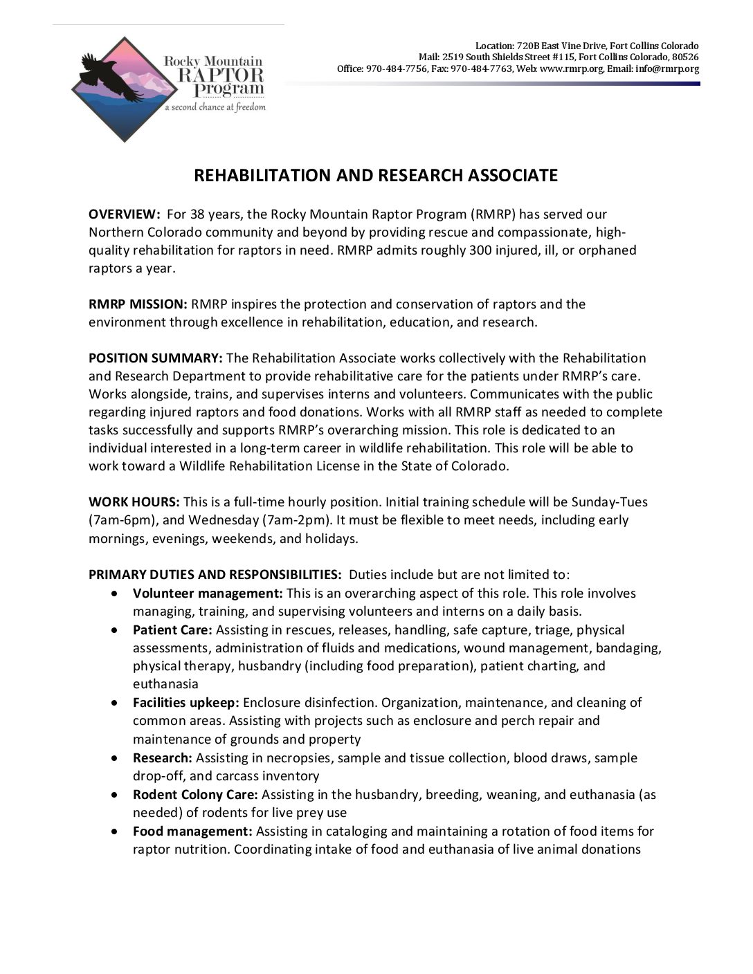 POSITION SUMMARY: The Rehabilitation Associate works collectively with the Rehabilitation and Research Department to provide rehabilitative care for the patients under RMRP’s care. Works alongside, trains, and supervises interns and volunteers. The applicant will be able to work toward a Wildlife Rehabilitation License in the State of Colorado.